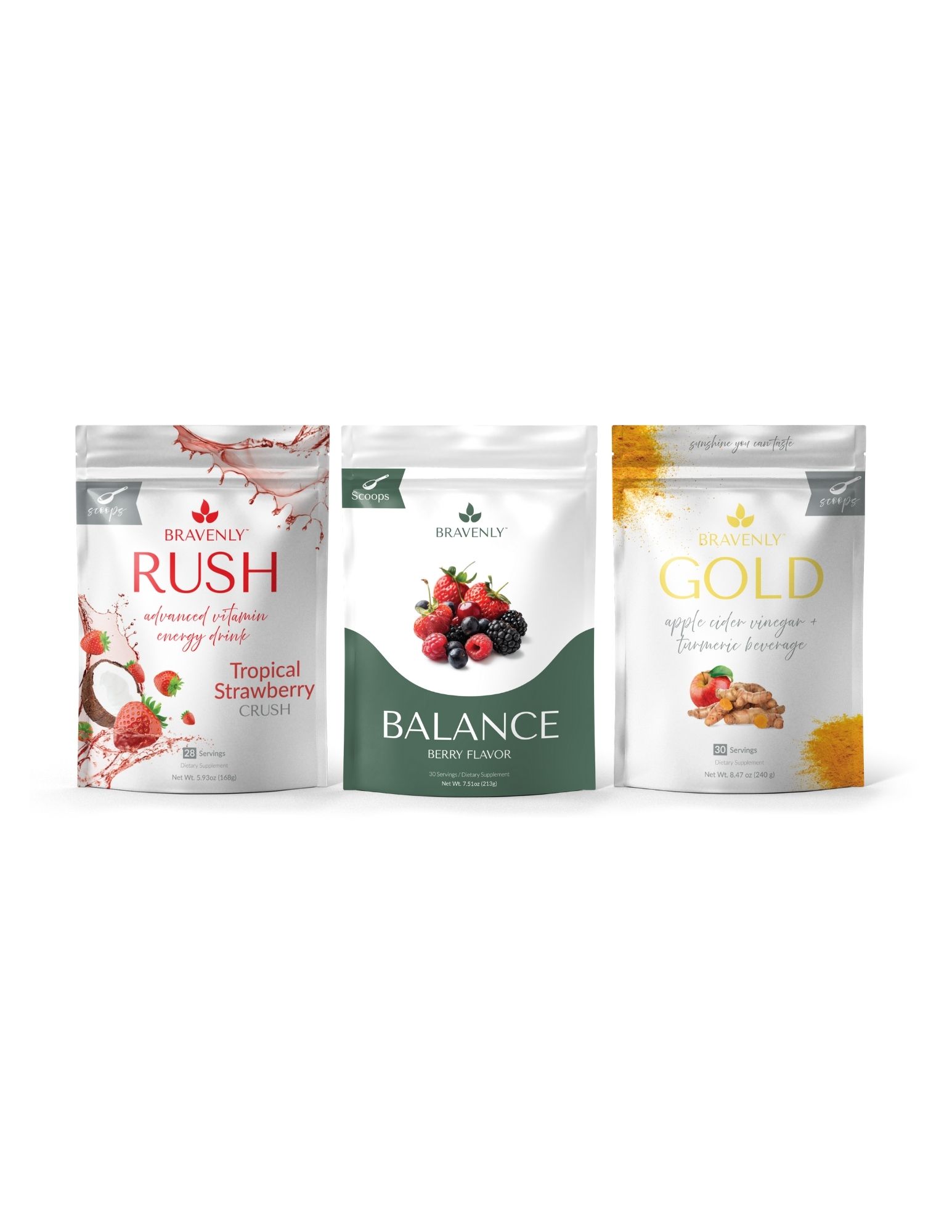 Included: Balance (scoops), Gold (scoops and capsules), and your choice of Rush, Rush Extreme, or Brew Extreme
